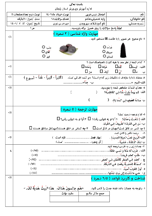 دوره اول متوسطه هفتم عربی زنجان ناحیه 2 زنجان سهروردی خرداد 1401
