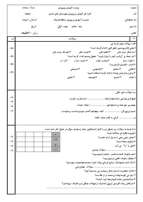 آزمون های مجموعه ای نوبت اول درس فارسی پایه هفتم