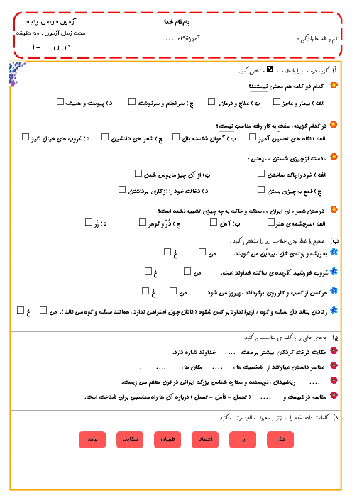آزمون مدادکاغذی فارسی پنجم دبستان میرزا رضا کرمانی | درس 1 تا 11
