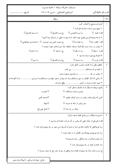 آزمون مداد کاغذی درس 15 و 16 مطالعات اجتماعی پنجم دبستان سمانه
