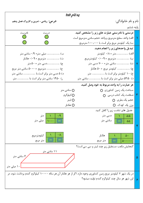 کاربرگ ریاضی ششم دبستان بعثت | اندازه گیری طول، سطح، حجم و جرم