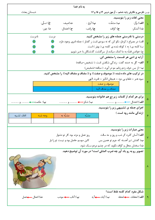 نمونه سوال امتحانی کتاب فارسی درس 14 تال 16 | درس راز زندگی، میوه هنر و آداب مطالعه پایه ششم همراه با پاسخنامه تشریحی