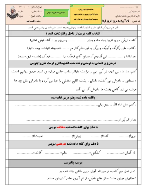 آزمون مداد کاغذی فارسی پنجم دبستان راشد | درس 9 از فصل 4 تا فصل 6\