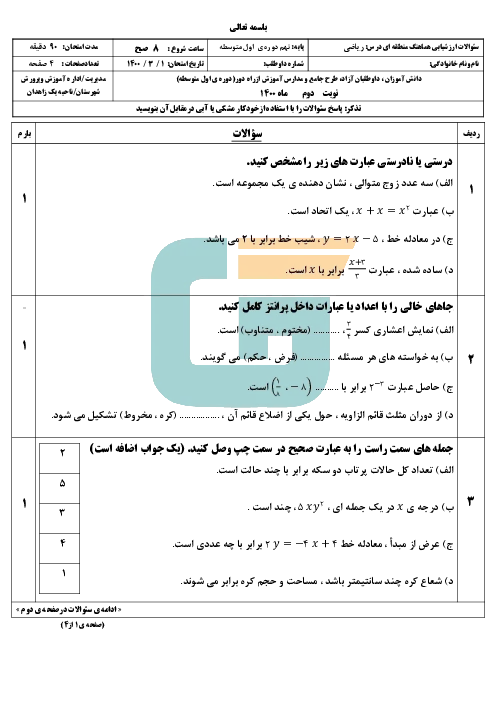 سؤالات امتحان هماهنگ ریاضی پایه نهم ناحیه 1 زاهدان | خرداد 1400