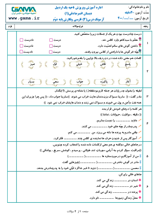 آزمون درس 4 فارسی و نگارش دوم ابتدائی | مدرسه ی خرگوش ها ﺩﺭ ﻕﺎﻠﺑ word ﻭ ﻕﺎﺒﻟ ﻮﯾﺭﺎﯿﺷ ﺕﻮﻀﯿﺣﺎﺗ ﺖﮑﻤﯿﻠﯾ ﺖﺻﺍﻮﯾﺭ