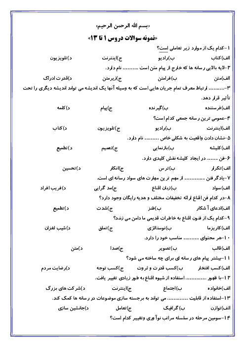 نمونه سوال امتحانی تستی درس تفکر و سواد رسانهای درس 1 تا 13 پایه دهم دبیرستان همراه با پاسخنامه کلیدی