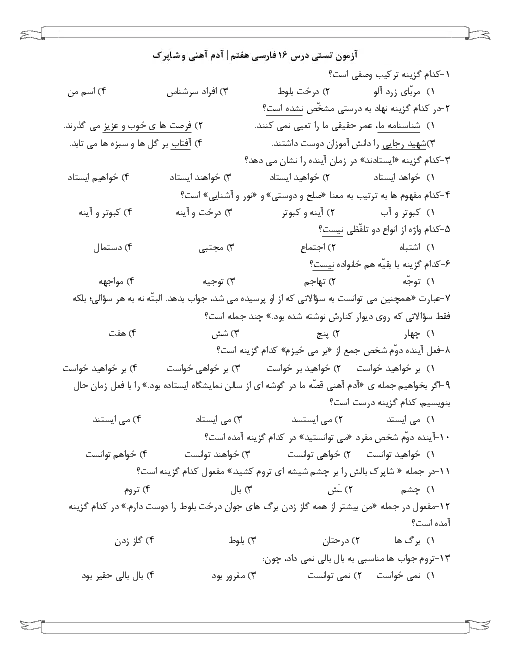 سوالات تستی فارسی هفتم مدرسه حضرت زینب ری | درس 16: آدم آهنی و شاپرک