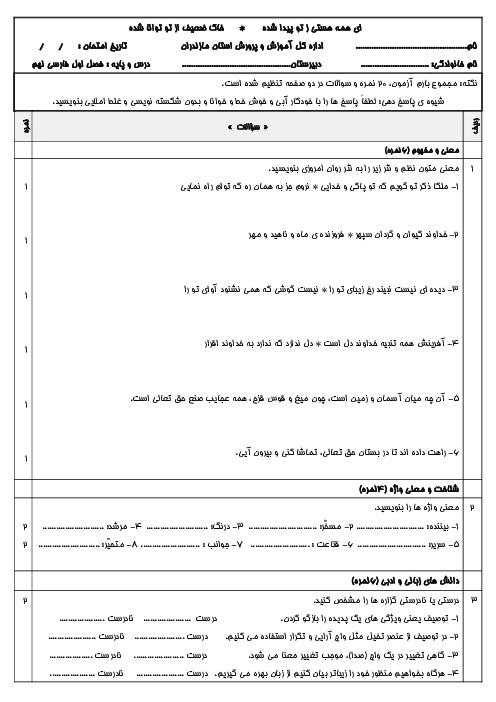 نمونه سوال امتحانی فارسی کتاب درس 1 و 2 پایه نهم