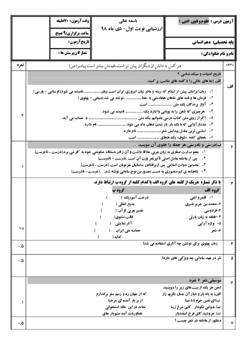 آزمون نوبت اول علوم و فنون ادبی 1 سال دهم دبیرستان شهید اژه ای اصفهان | دی 1398