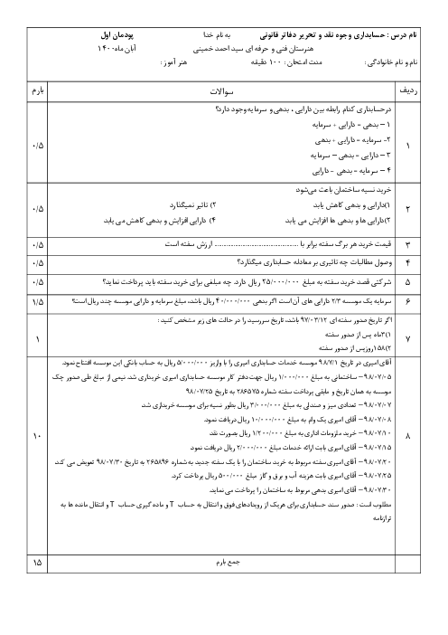 نمونه سوال امتحانی پودمانی درس حسابداری وجوه نقد و تحریر دفاتر قانونی | پودمان 1: حسابداری پرداختها پایه دهم همراه با پاسخنامه تشریحی