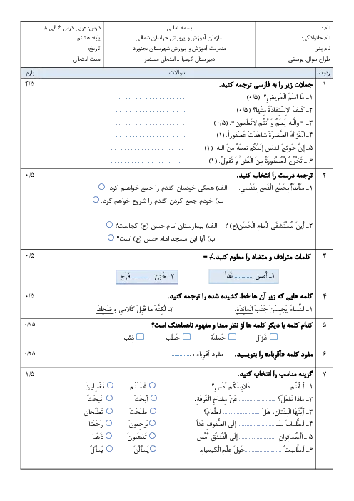 امتحان میان ترم دوم (درس 6 تا 8) عربی هشتم دبیرستان کیمیا