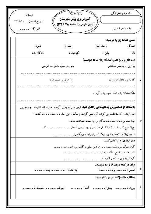 نمونه سوال امتحانی اردیبهشت 1398 فارسی درس 10 تا 17 پایه پنجم دبستان همراه با پاسخنامه تشریحی