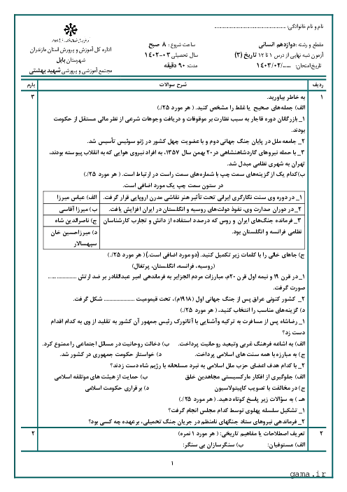 آزمون شبه نهایی خردادماه 1403 تاریخ (3) پایه دوازدهم انسانی ناحیه بابل