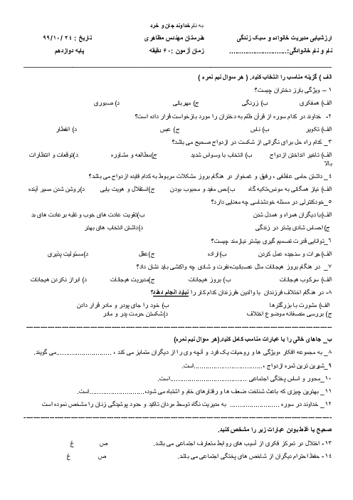 سوالات آزمون نوبت اول مدیریت خانواده و سبک زندگی (دختران) دوازدهم | دی 1399