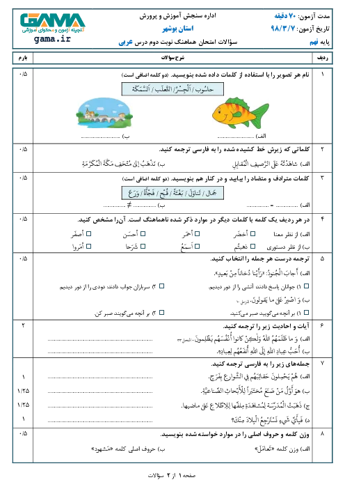 سؤالات امتحان هماهنگ استانی نوبت دوم عربی پایه نهم استان بوشهر | خرداد 1398