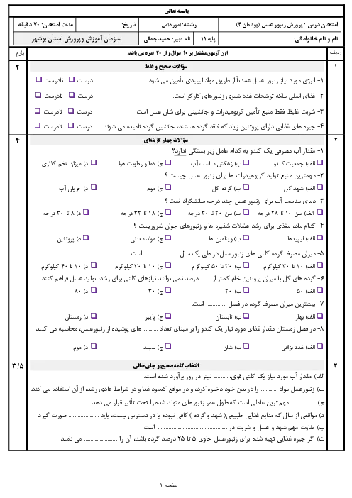 نمونه سوال امتحانی درس پرورش زنبورعسل | پودمان 4: تغذیه و انتقال کلنیهای زنبور عسل پایه یازدهم هنرستان همراه با پاسخنامه تشریحی