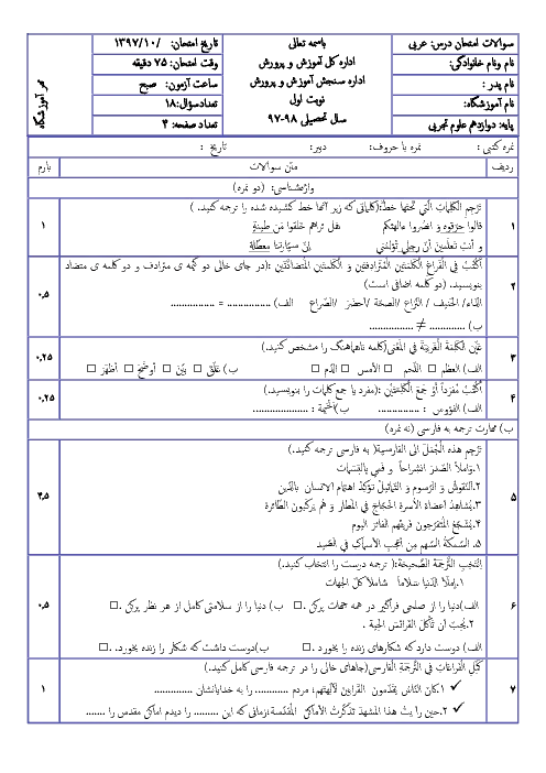 نمونه سوال امتحان نوبت نوبت اول عربی (3) دوازدهم تجربی و ریاضی