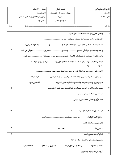 آزمون مرحله ای پیام های اسمان نهم مجتمع عطار سمیرم | درس 1 تا 5