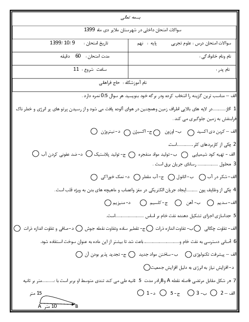 امتحان ترم اول علوم تجربی نهم مدرسه حاج فراهانی ملایر | دی 1399