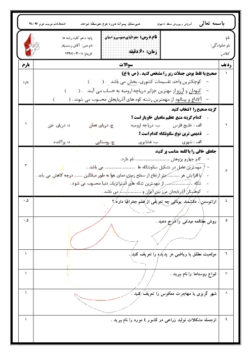 آزمون نوبت دوم جغرافیای ایران و استانشناسی تهران پایه دهم دبیرستان موحد | خرداد 1397 + پاسخ