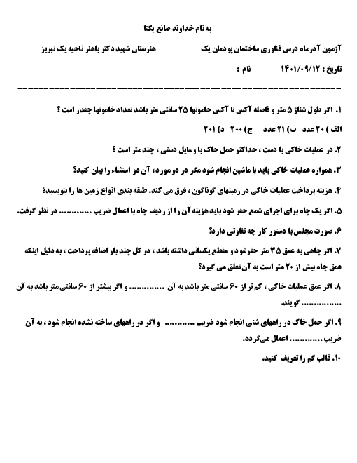 آزمون فناوریهای ساختمان انجینی دوازدهم هنرستان شهید دکتر باهنر | پودمان 1: متره و برآورد