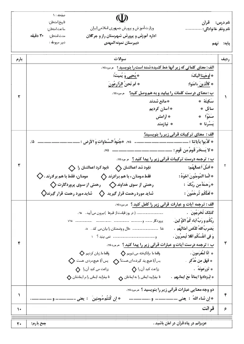 سوالات آزمون نوبت اول قرآن نهم دبیرستان نمونه المهدی | دی 1400