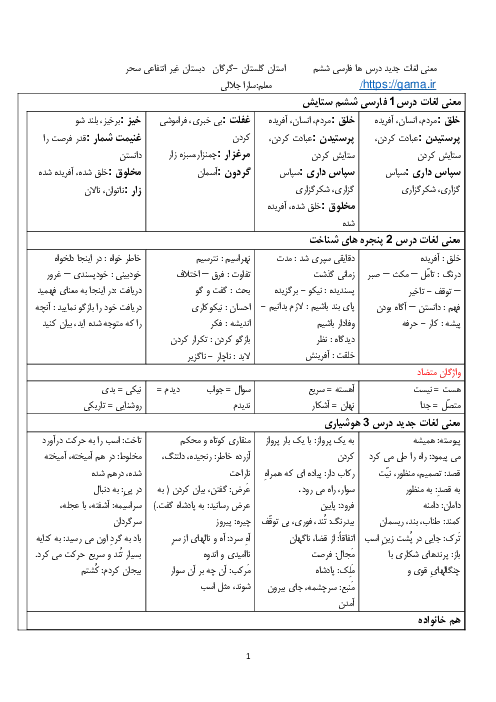 درسنامه و جزوه لغات کتاب فارسی دروس 1 تا 17 | هم معنی، هم خانواده و متضاد پایه ششم دبستان
