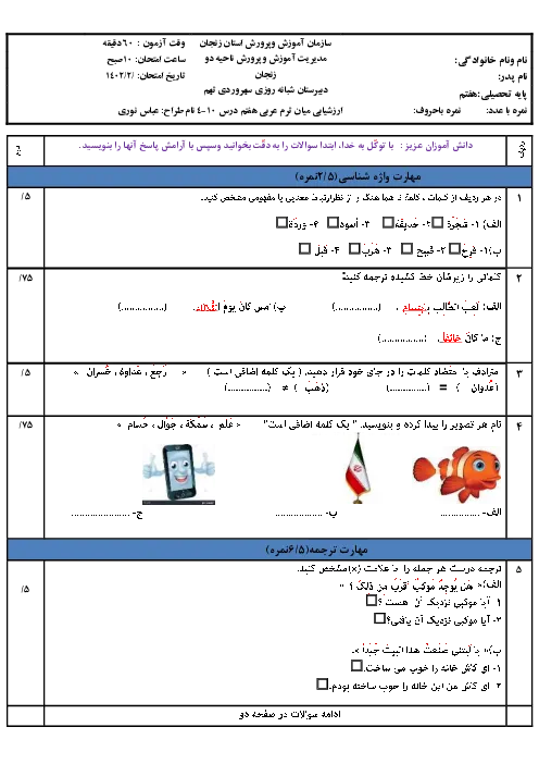 امتحان میان ترم دوم عربی هفتم مدرسه سهروردی | درس 4 تا 10