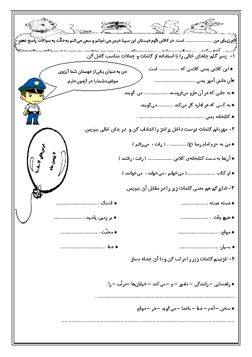نمونه سوال مدادکاغذی فارسی درس 7 تا 9 پایه دوم دبستان