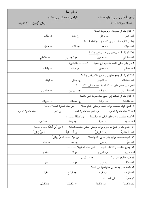 ازمون آغازین عربی برای پایه هشتم می باشد تا سطح یادگیری دانش آموزان از عربی هفتم سنجیده شود