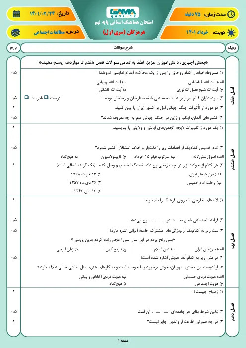 امتحان هماهنگ نوبت دوم مطالعات اجتماعی پایه نهم استان هرمزگان | خرداد 1401