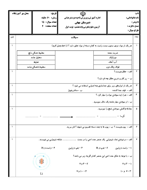 آزمون نوبت اول علوم تجربی هشتم مدرسه بیهقی | دی 96 + پاسخ