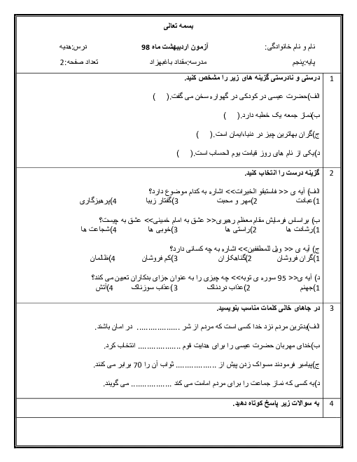 آزمون نوبت دوم هدیه های آسمانی پنجم دبستان مقداد | اردیبهشت 1398
