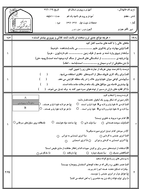 آزمون نوبت اول علوم تجربی هفتم مدرسه شهید محمد منتظری | دی 96