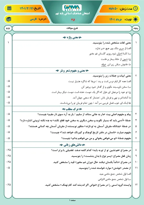 نمونه سوال امتحانی ترم دوم هماهنگ خرداد 1401 درس فارسی پایه نهم