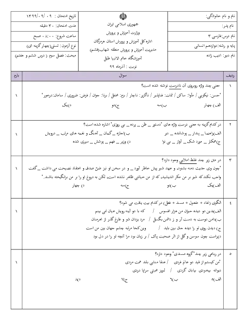 آزمون تستی فارسی (3) فصل 3: ادبیات غنایی (درس 6 و 7) پایه دوازدهم دبیرستان همراه با پاسخنامه تشریحی