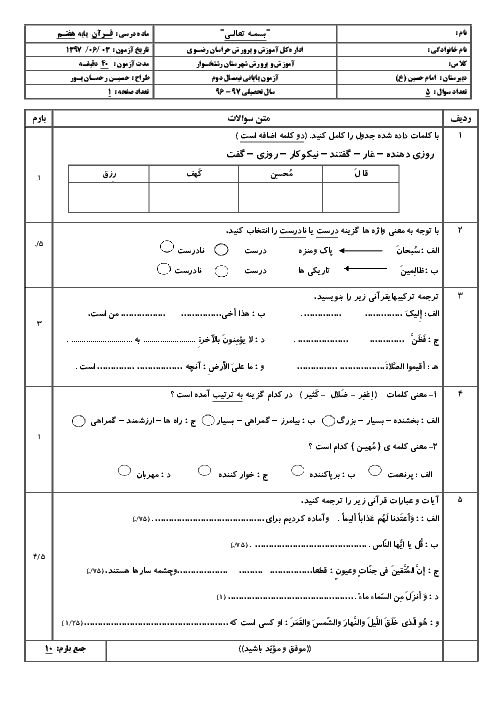 امتحان جبـرانـی نـوبـت دوّم قــرآن پایه هفتـم مدرسـه امام حسین (ع) | شهـریـور 1397 + پـاسـخ