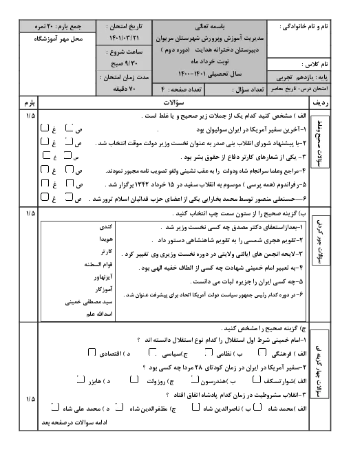 سوالات امتحان نوبت دوم تاریخ معاصر ایران یازدهم دبیرستان دخترانه هدایت | خرداد 1401