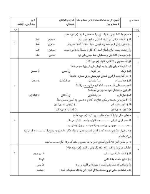 نمونه سوال امتحانی مطالعات اجتماعی فصل 11 و 12 (درس 21 تا 24) پایه هفتم همراه با پاسخنامه تشریحی