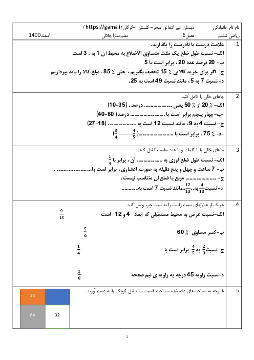 نمونه سوال امتحانی مدادکاغذی ریاضی فصل 6: تناسب و درصد پایه ششم دبستان همراه با پاسخنامه تشریحی