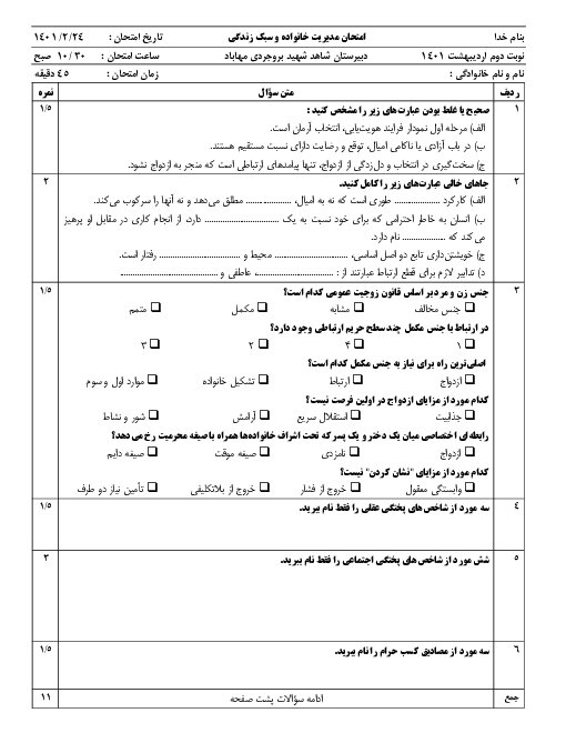 دوره دوم متوسطه- نظری دوازدهم علوم تجربی مدیریت خانواده و سبک زندگی پسران آذربایجان غربی مهاباد شهید بروجردی اردیبهشت 1401\nآزمون پایانی مدیریت خانواده و سبک زندگی پسران دوازدهم تجربی و ریاضی دبیرستان شاهد شهید بروجردی مهاباد
