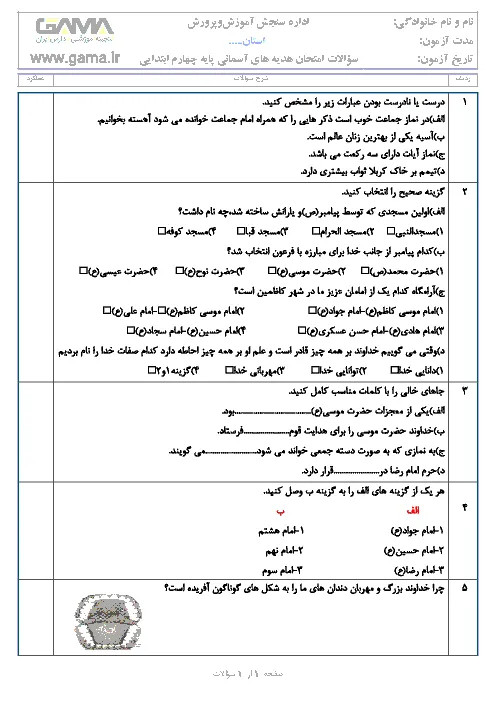 آزمون نوبت اول هدیه های آسمانی چهارم دبستان جامی 1 سرعین | دی 96: درس 1 تا 7