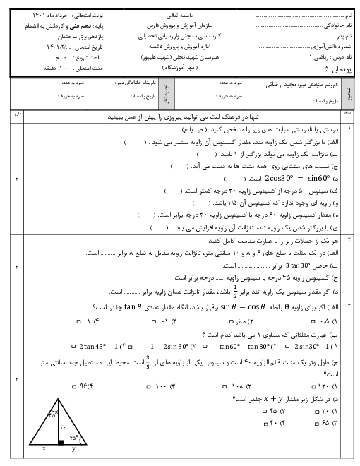 آزمون پودمانی ریاضی (1) فنی دهم هنرستان شهید بخشعلی نجفی | پودمان 5: نسبتهای مثلثاتی