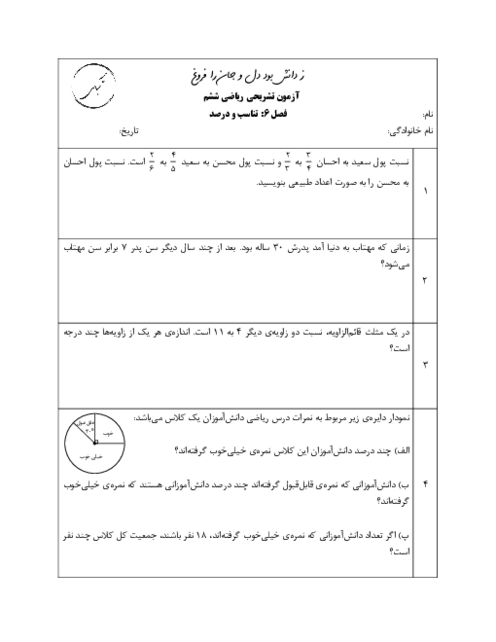 نمونه سوال امتحانی مداد کاغذی ریاضی فصل 6: تناسب و درصد پایه ششم دبستان همراه با پاسخنامه تشریحی