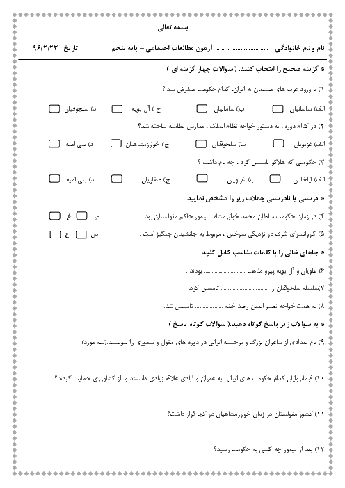 نمونه سوال امتحانی مطالعات اجتماعی فصل 5: ایران بعد از اسلام (درس 19 تا 22) پایه پنجم دبستان |