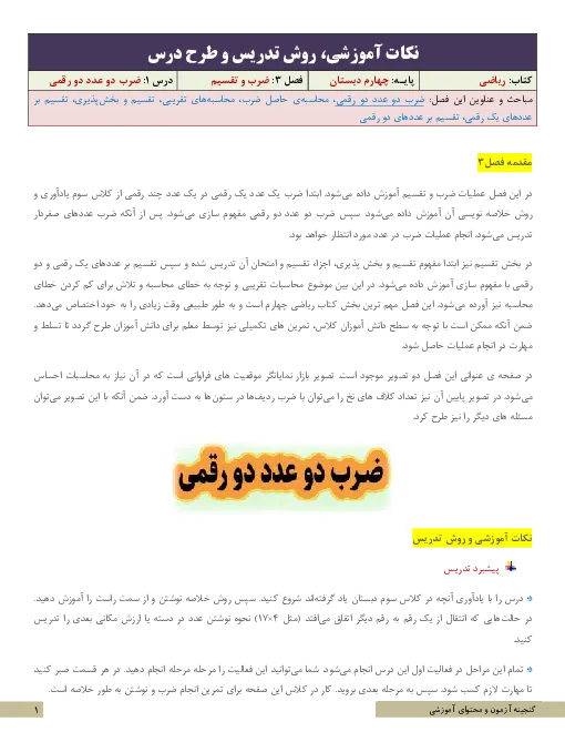 نکات آموزشی، روش تدریس و طرح درس ریاضی چهارم | فصل 3: ضرب و تقسیم | درس 1: ضرب دو عدد دو رقمی