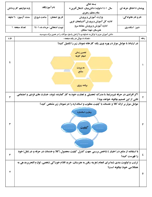 آزمون پودمانی اخلاق حرفهای دوازدهم هنرستان شهدا | پودمان 5: بهرهوری
