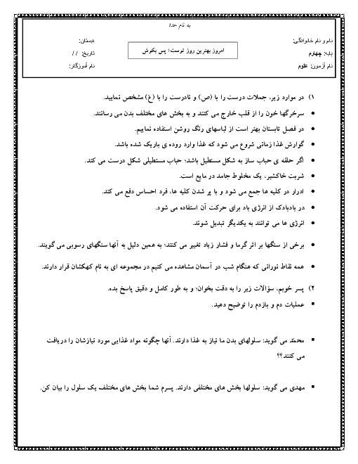 ارزشیابی مستمر علوم تجربی چهارم دبستان ابن سینا | درس 1 تا 10
