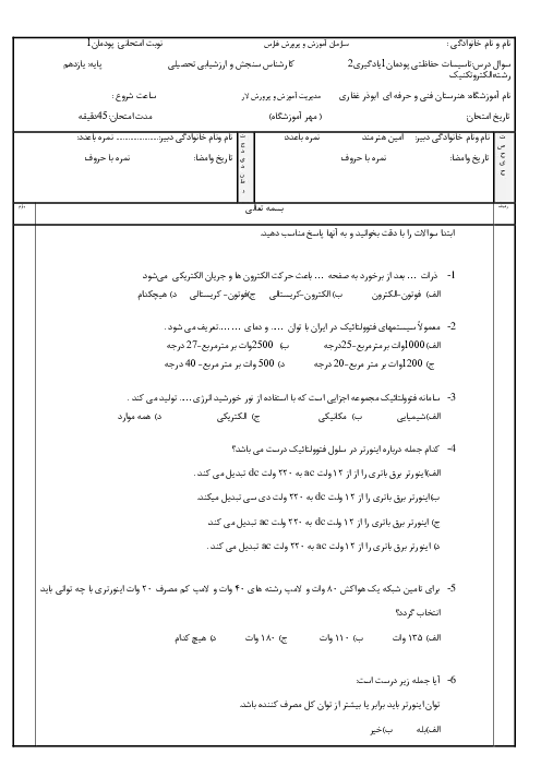 نمونه سوال امتحانی پودمانی طراحی و نصب تاسیسات حفاظتی و ساختمان های هوشمند پودمان 1: برق اضطراری و پشتیبان پایه