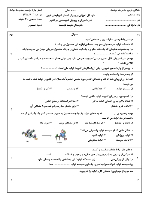 سوالات امتحان مدیریت تولید یازدهم هنرستان شهید حسین فهمیده | پودمان 1: تولید و مدیریت تولید